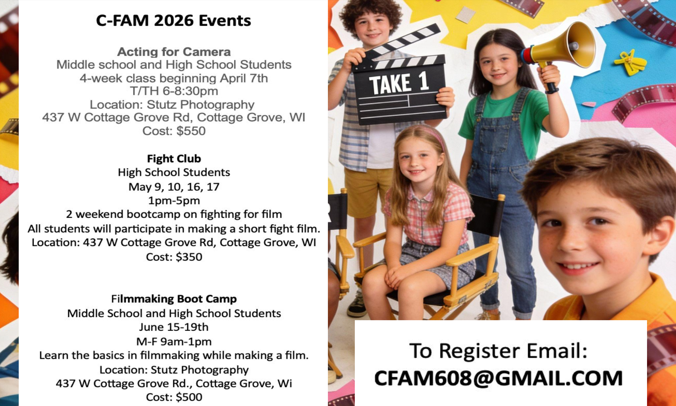 C-FAM will be producing a few short films this year, watch social media for audition announcements. We may have more boot-camps scheduled about Southern Wi, and we are available for private on-camera instruction.